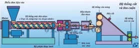 – Hỗn hợp nguyên liệu sau khi trộn được đưa vào máy đùn. Nguyên liệu sẽ được đốt nóng chảy thông qua hệ thống nhiệt và được trục vít đẩy nguyên liệu qua phần khuôn nóng để hoàn thành quá trình nhựa hóa. Sau đó được kéo qua hệ thống khuôn ép lạnh để định hình tấm, tạo độ dày mỏng cho tấm nhưng chưa có kích thước chuẩn và là một dải dài